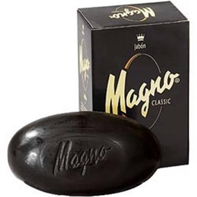 Savon noir Magno fabriqué en EspagneThe very famous Magno black glycerin soap is a Spanish classic. Even though the bar of soap is black this soap produces the most opulent, white, frothy lather and its fragrance is unmistakenly distinctive. Many people first become acquainted with Magno soap during their travels in Spain. Two bars per pack, 125grams each.